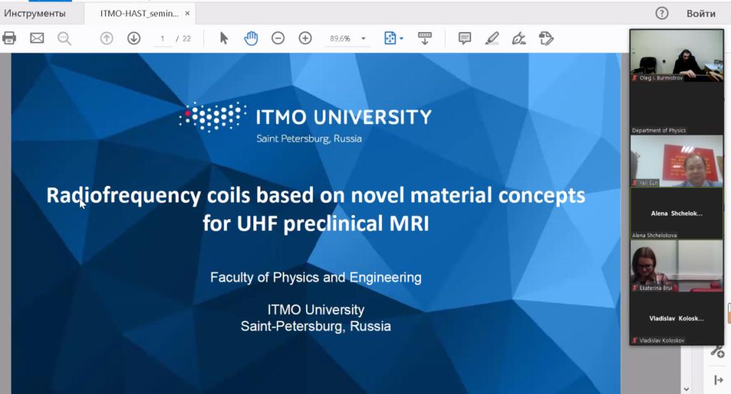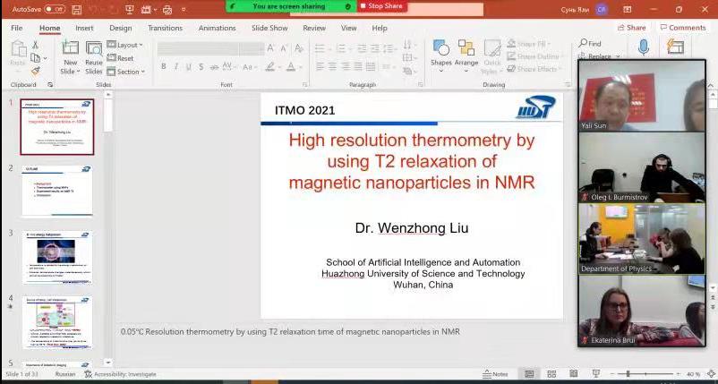 随后,圣光机大学Anna A. Hurshkainen做了题为“Radiofrequency coils based on novel material concepts for UHF preclinical MRI”的学术报告,内容涉及新型材料用于MRI成像相关的前沿研究领域。报告后,会议双方互相交流提问并解答。最后,刘文中教授与圣光机大学物理公司团队互相答谢,会议取得圆满成功。