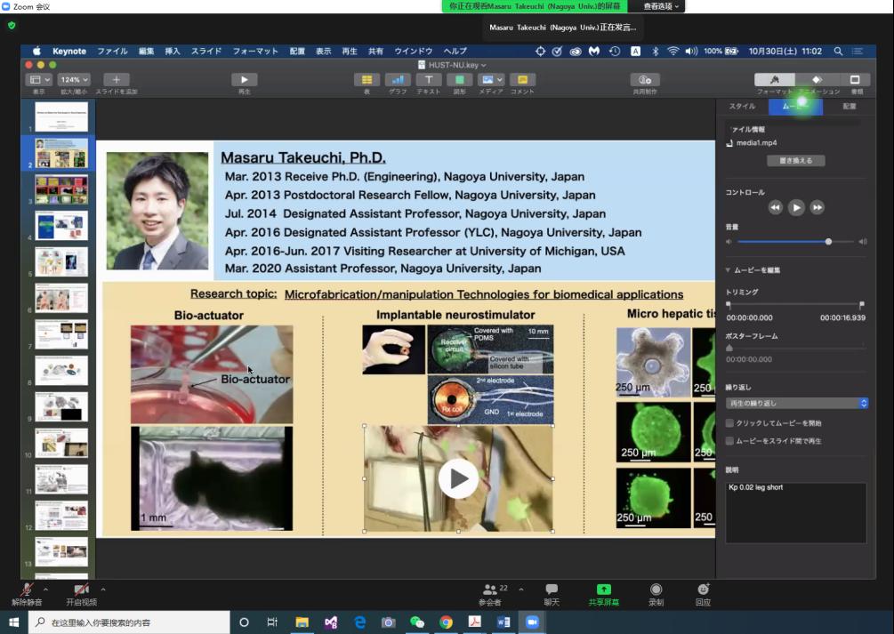 第三次讲座由名古屋大学的竹内大(Masaru Takeuchi)教授题为Wireless and Battery-free Technologies for Neural Engineering(用于神经工程的无线和免电池技术)的报告。他首先介绍了用于生物医学应用的微加工操作技术,重点讲述了使用植入式神经刺激器重建步行运动的研究。最后,分享了运动神经元整合横纹肌的研究,该研究可促进催生治疗神经损伤的新策略。