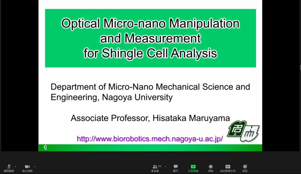 第二次讲座由名古屋大学的丸山央峰(Hisataka Maruyama)教授作了题为Optical Micro-nano Manipulation and Measurement for Single Cell Analysis(用于单细胞分析的光学微纳操作和测量)的学术报告。他首先简述了微流控芯片和微操作的优点,展示了用于微环境测量的荧光微传感器,并演示了多荧光微工具的制作流程。他还介绍了单病毒感染与受感染细胞的温度和pH测量,并讲解了将单传感器注入细胞内进行细胞内测量的相关知识。