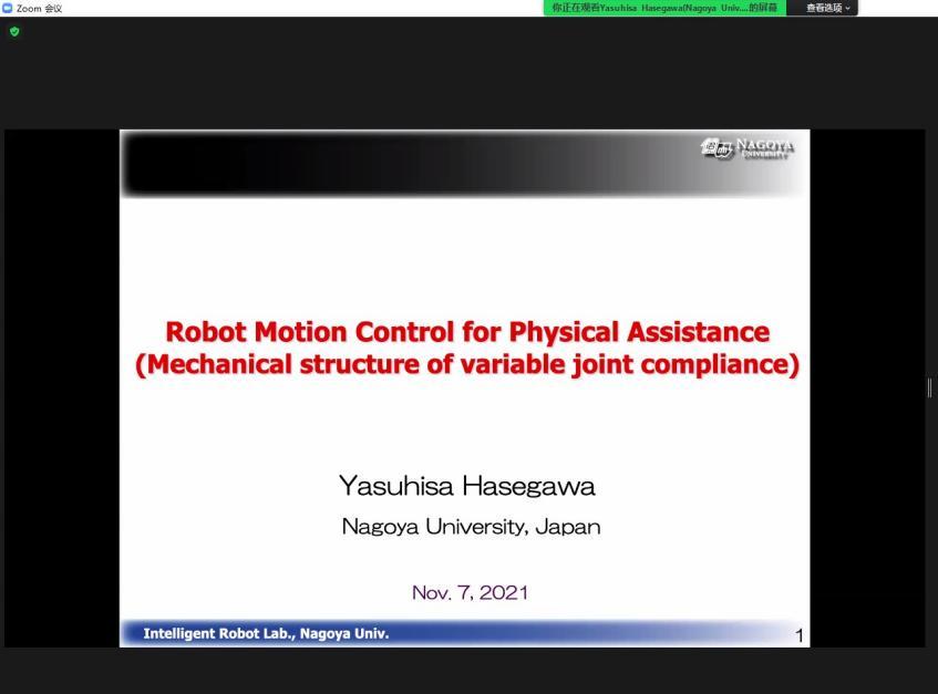 第六次讲座由名古屋大学的长谷川泰久(Yasuhisa Hasegawa)教授作题为“Robot Motion Control for Physical Assistance-Mechanical Structure of Variable Joint Compliance”(用于身体辅助的机器人运动控制-可变关节柔度的机械结构)的报告。他介绍了可穿戴机器人的关键技术和可变刚度的柔性驱动关节,深入浅出地依次讲解了刚度与柔顺性的关系,自适应柔顺性的实现。最后,介绍了可变刚度柔性驱动关节在辅助机器人系统中的应用。