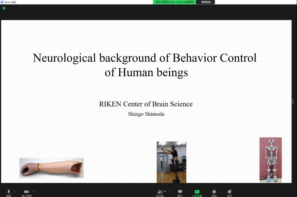 第七和第八次讲座由日本理化学研究所的下田真吾(Shingo Shimoda)博士作题为“Neurological Background of Behavior Control of Human Beings: Brain Mechanism and Signal Pathways”(人类行为控制的神经学背景:脑机制和信号通路)和“Neurological Background of Behavior Control of Human Beings: Application for rehabilitation”(人类行为控制的神经学背景:康复领域的应用)的报告。两次报告目的在于了解人类控制行为和学习动作的信号通路,神经损伤对行为控制的影响,以及如何设计有效的康复训练方法。下田真吾博士明确指出,适应未知的环境是大脑活动最重要的特征,并且在此基础上引出对神经学背景的介绍。