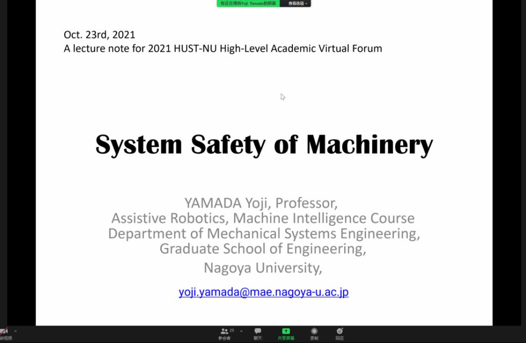 第一次讲座由名古屋大学的山田阳滋(Yamada Yoji)教授进行专题报告,报告题为System Safety of Machinery(机械的系统安全)。山田教授首先讲述了人机共存的生产系统案例,其后,他对机械的失效进行建模,并利用该模型对机器人发生故障引发的与人碰撞的场景进行了仿真分析。他还介绍了物品可用的生命周期和系统冗余的相关知识。