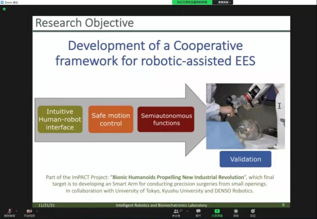 第九次讲座由名古屋大学助理教授朱曜南(Yaonan Zhu)博士进行题为“Master-Follower Control for minimum Invasive Surgery”(用于微创手术的主从式控制)的专题报告。此次讲座主要介绍其团队在微创手术机器人方面的研究,包括鼻内窥镜手术(Endoscopic endonasal surgery, EES)等微创手术、人机接口设计以及机器人辅助缝合等的研究。