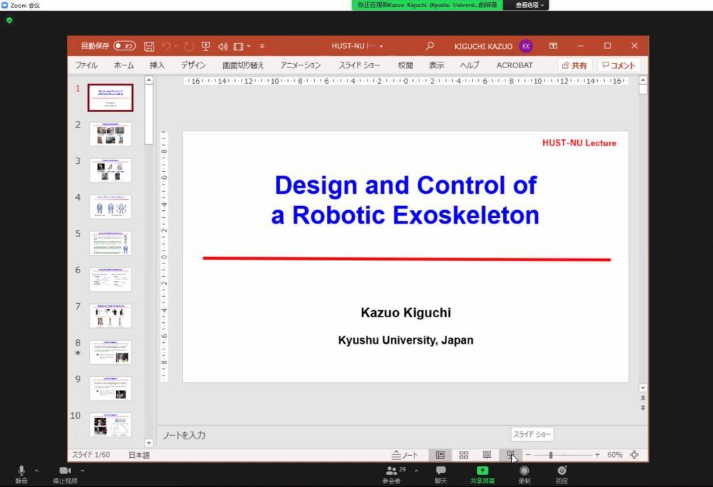 第十次讲座由日本九州大学的木口量夫(Kazuo Kiguchi)教授进行题为“Design and Control of a Robotic Exoskeleton”(机器人外骨骼的设计与控制)的专题报告。木口教授介绍了其在外骨骼机器人的机构设计、人体意图识别和人机交互控制方面的研究成果。