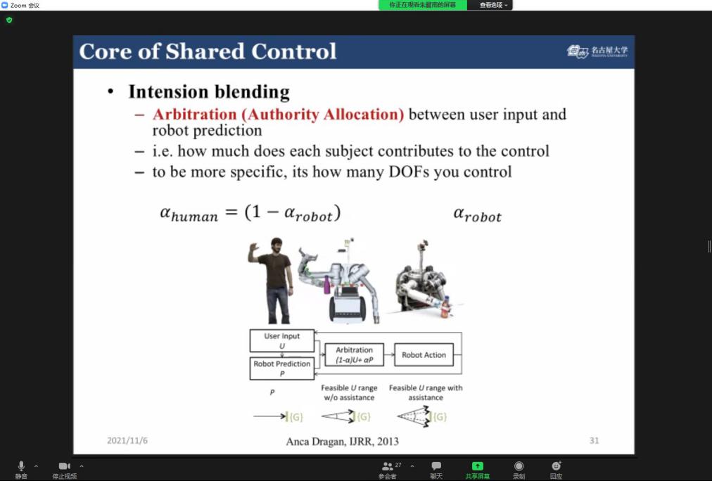第五次讲座由名古屋大学的朱曜南(Yaonan Zhu)教授作题为“Robotic Teleoperation for Transparent Synergy between Human and Machines”的报告。报告讲述了关于远程操作和传输的设想,由此引入了遥操作。探讨了远程操作的架构,双边内容和典型的控制框架,还涉及共享控制的应用,并与深度学习相结合实现控制与抓握。