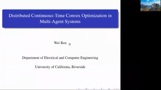 美国加州大学河滨分校教授、IEEE Fellow任伟教授,做了题为Distributed Continuous-time Optimization in Multi-agent Systems的报告。他深入研究了连续时间下多智能体系统的分布式凸优化问题。其目标是通过局部信息交互来最小化局部代价函数之和,且每个智能体只能获知对应的个体代价函数。他还介绍了连续时间的分布式控制算法,仿真和实验结果验证了理论结果的有效性。