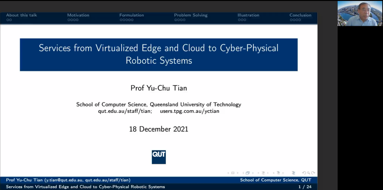 澳大利亚昆士兰科技大学田玉楚教授做了题为Services from Virtualized Edge and Cloud to Cyber-physical Robotic Systems的报告。当多个机器人部署在一个较大的地理区域时,该课题组利用机器人周围的边端资源来处理机器人的多个实时任务,避免了与云中心通信的较大延迟。在边缘资源受限于能源和资源的情况下,多个有时限要求的实时机器人任务之间共享边缘资源是至关重要的。针对该问题,其课题组通过在优化框架中制定并使用计算智能技术,很好的解决了边端与机器人的资源限制的问题。