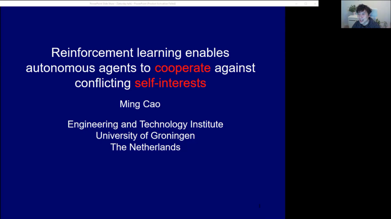荷兰格罗宁根大学教授、IEEE Fellow曹明教授做了题为Cooperate against Conflicting Self-interests”的主题报告。他介绍了近年来困扰着使用自主机器人工作的工程师的社会困境现象,即当自主智能体被理性目标驱动以优化个人利益时,与团队任务的矛盾。他提出机器学习,尤其是强化学习,可以使自主智能体集群适应随机变化的环境,并显著改善在社会困境中的相互协作。其课题组建立了将强化学习与随机社会决策相结合的新框架,显著提高了群体自主系统的交互性和环境自适应性。