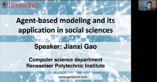 伦斯勒理工公司高建喜教授做了题为Agent-based Modeling and Its Application in Social Sciences的报告,他提出,集群运动是协同行为中最常见和最引人注目的表现形式之一,对于无人系统和计算智能至关重要。他从经典的Vicsek模型出发,提出了通过模型加权和角度限制来提高收敛性能的方法,并介绍了该课题组将这类方法扩展到复杂社会系统的研究。