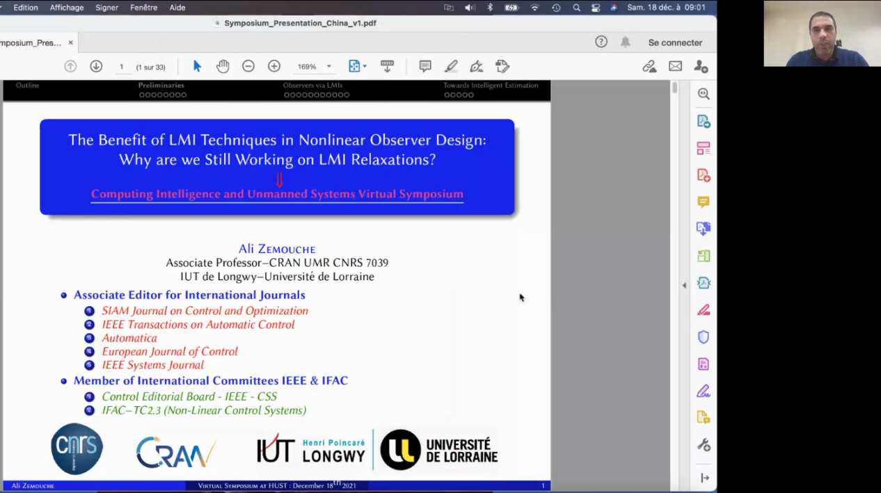 法国洛林大学Ali Zemouche副教授做了题为The Benefit of LMI Techniques in Nonlinear Observer Design: Why we are still working on LMI relaxations?的主题报告,讨论了满足某些非线性特性的非线性系统观测器设计问题。首先介绍了其主要研究基于线性矩阵不等式(LMI)的方法及其在改进一类大型非线性系统观测器设计中的应用。随后探讨了LMI松弛技术,并针对基于LMI技术的优点和局限性,提出了克服系统保守性的方法。