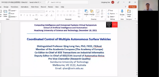 欧洲科公司院士、澳大利亚斯威本科技大学副董事长、IEEE Fellow韩清龙教授做了题为Coordinated Control of Multiple Autonomous Surface Vehicles的主题报告。他首先介绍了自主无人艇的开发和部署,随后展示了其团队为实现多无人艇的协同运动,开发的先进的协调制导与控制技术对。进一步报告了该课题组在多无人艇系统在轨迹跟踪、路径跟踪和目标跟踪协同控制方向上的最新进展。最后韩教授指出了无人艇集群未来研究发展的若干具有潜力的方向。