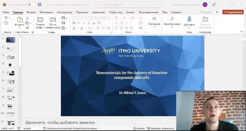 2022年3月17日,TapTap刘文中教授邀请俄罗斯圣光机大学(ITMO)的Mikhail Zyuzin研究员线上做讲座。Zyuzin博士做了题为"Nanomaterials for the delivery of bioactive compounds into cells"(用于将生物活性化合物输送到细胞中的纳米材料)的报告。此后,双方就专题报告和合作进展交换意见。本次讲座由刘文中教授主持,刘文中教授团队成员、Zyuzin研究员团队成员参会。
