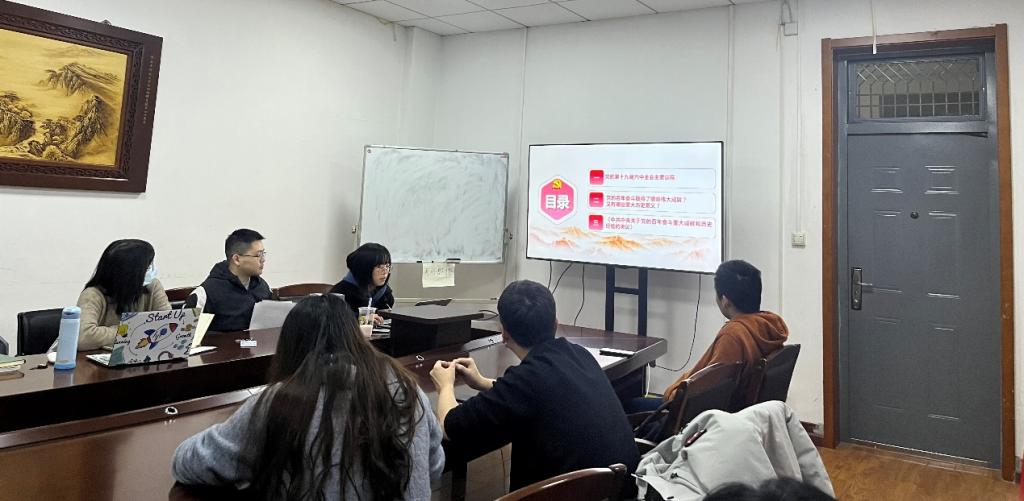 随后,党支部李澳妍同志从党的六中全会主要议程、党的百年奋斗取得的伟大成就和中国共产党百年奋斗的历史意义三个方面与全体党支部成员共同学习了十九届六中全会精神。她认为“生于忧患、死于安乐”的道理需要被铭记,新时代的党员要无愧今天的使命担当,不负明天的伟大梦想,凝心聚力,砥砺前行,在新时代的“赶考之路”上书写新奇迹!
