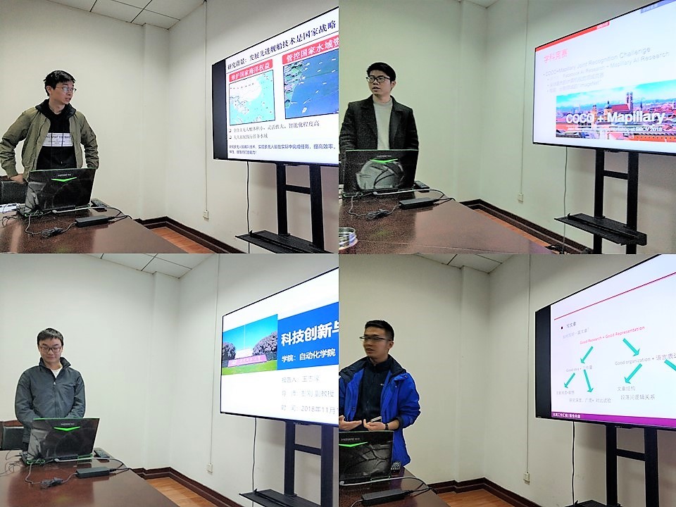 连续3年获评“优秀员工干部”,发表多篇高水平论文的14级博士班班长刘晓康表示,科技创新能力的提高需要坚实的专业基础和坚忍不拔的创新精神,鼓励大家注重基础知识学习。担任多项重要国际期刊审稿人的16级博士昌毅谈到,好的文章不是技术报告,而是在讲故事,讲好自己的故事是写好文章的关键。入学两年,参加COCO+ Mapillary国际比赛并荣获两项冠军的16级硕士余昌黔建议,研究要从找资源开始,兵马未动,粮草先行,多阅读文献,主动复现文献结果。17级专业硕士操延燚以一篇论文作为范例,强调写作时要注意科学性、创造性、逻辑性和有效性四个方面,表示学术诚信是大学精神的根本,我们当代研究生同学应该继续弘扬与传承。