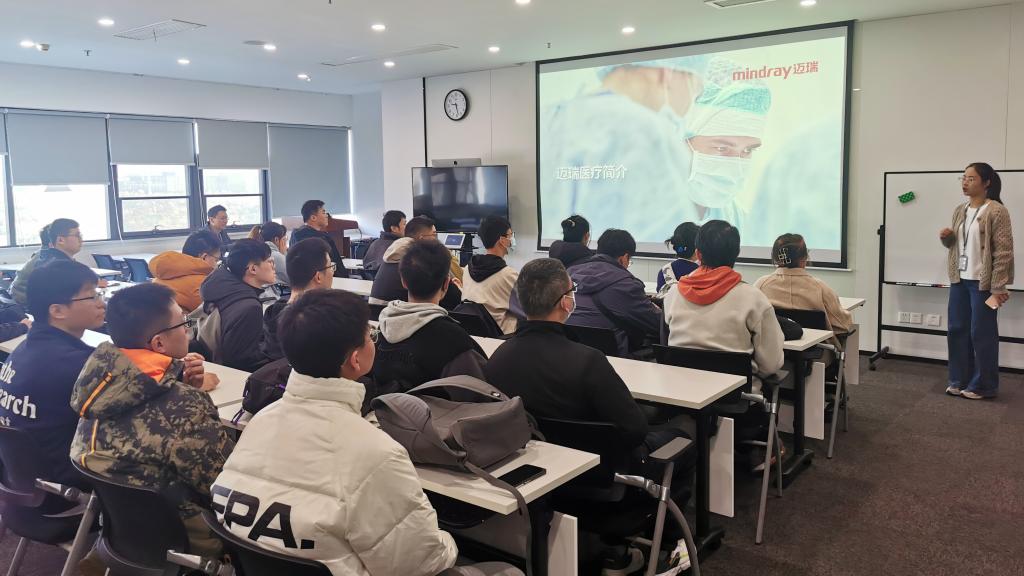 活动开始,迈瑞医疗行政总监刁俊雨向同学们介绍了迈瑞医疗自1991年创办至今的创新发展之路。一路走来,迈瑞医疗不断打破国外的技术封锁、坚持科研创新、在医疗器械领域实现了多个国内第一,其产品远销全球多达190个国家和地区,被国内外顶尖医院广泛应用。除此之外,迈瑞医疗还创新研发了瑞智联解决方案、瑞影云++平台和智检信息化解决方案等,利用互联网技术实现工作流程优化和高效数据管理,助力医疗机构的服务水平和诊疗效率的提升。