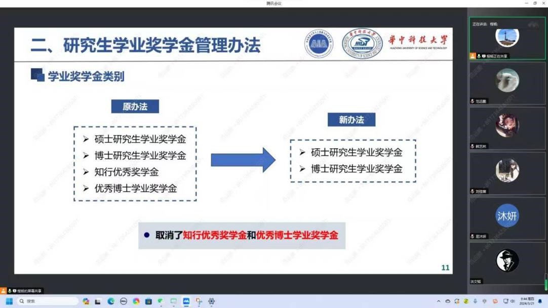 随后,程杨分别对研究生国家奖学金管理办法、研究生学业奖学金管理办法、研究生先进个人评选办法、优秀研究生奖学金管理办法、研究生学业助学金管理办法进行了政策文件的详细解读和说明,介绍了公司为构建多元化的奖助体系所做的具体工作,为研究生提供坚实的物质基础和强有力的政策保障。