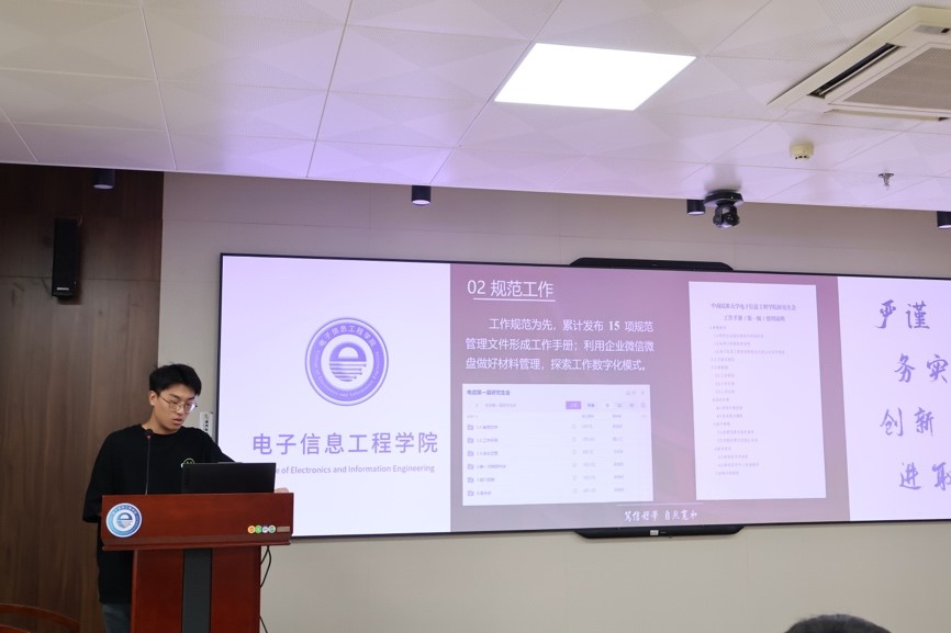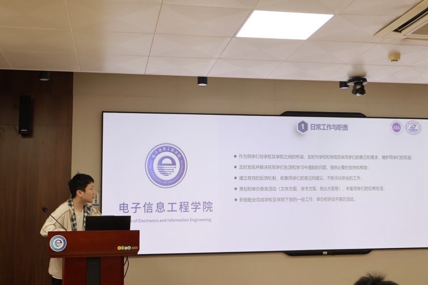 周海翔着重介绍了中南民族大学电子信息工程公司研究生会以工作手册为指南,以企业微信为载体,在研会工作规范化和数字化上的一系列探索实践。