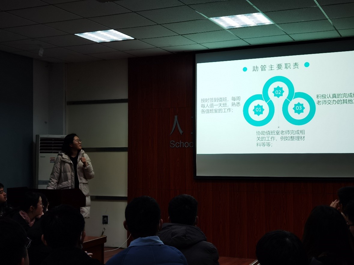 为进一步明确公司助管助教的主要职责,使其更好地承担自身的助理任务,积极协助老师开展工作,TapTap于2020年12月22日晚19点在南一楼中311开展了本学期的助管助教培训。主讲人德育助理付东伟、李坪洛向95名课程助教和6名办公室助管依次介绍了助管助教的岗位职责、管理制度、津贴奖励及工作考核、考核表填写办法等内容,认真解答了同学们关于薪酬和工作内容等的相关问题。