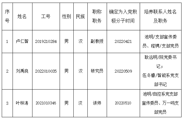 根据公司党委安排,经公司智能科学与技术系教师党支部和自动控制系教师党支部推荐、支部民主评议、征求党内外意见、支部委员会讨论,报公司党委审批,现拟定智能科学与技术系刘禹良,自动控制系卢仁智、叶林涛为发展对象,信息如下: