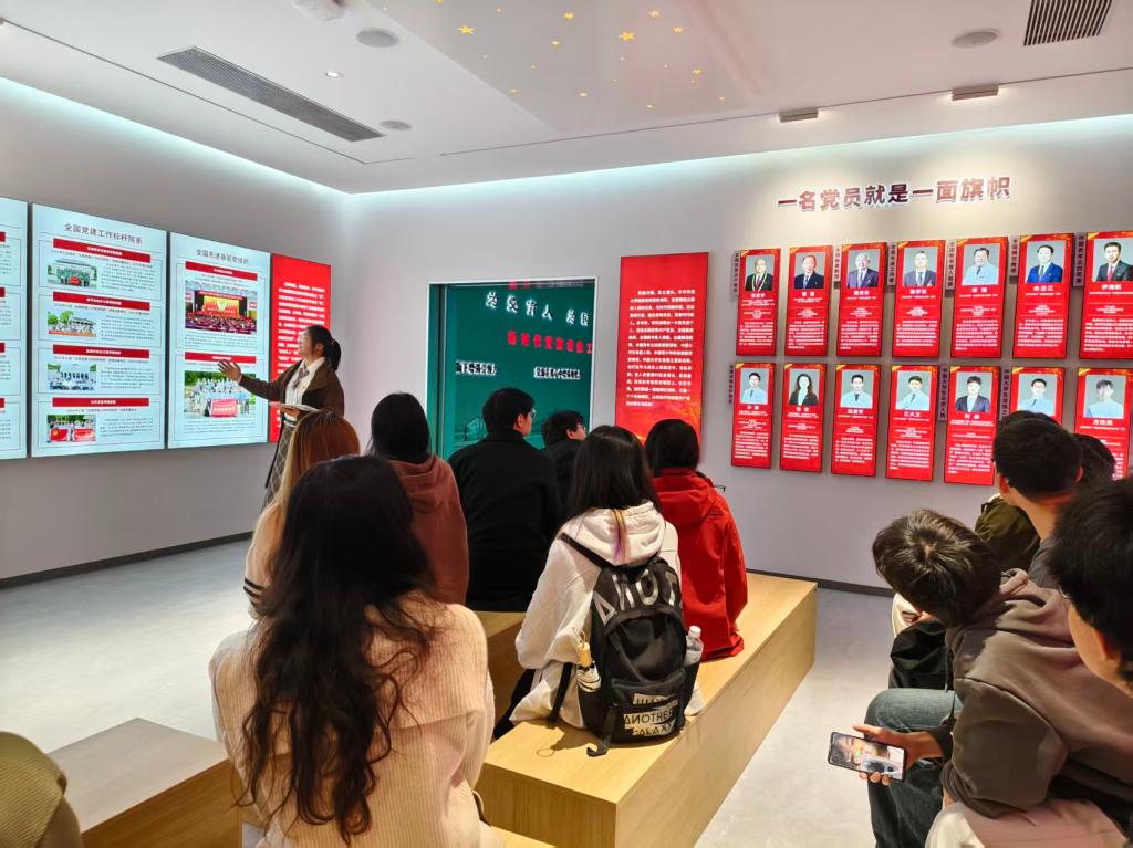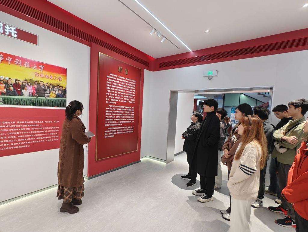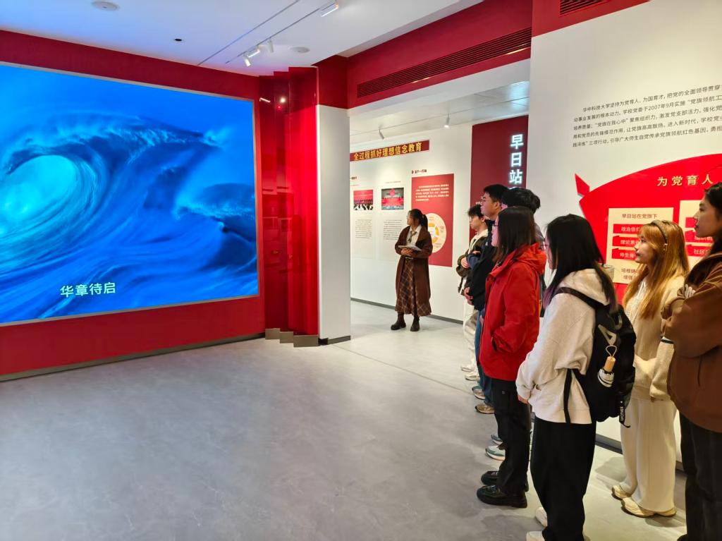 在党旗领航教育基地内,同学们系统学习了“党旗领航工程”的发展脉络:“早日站在党旗下”、“党旗在我心中”和“我为党旗添光彩”。从开展入学教育,到建立好基层党支部,再到“五个一”行动,同学们真切感受到了党旗领航工程所取得的重大成果。一幅幅承载公司党建成果的照片、一件件承载党员服务奉献精神的实物展品、一段段矢志报国的故事,静静诉说着华科大人牢记总书记嘱托,充分发挥党员先锋模范作用的志愿。