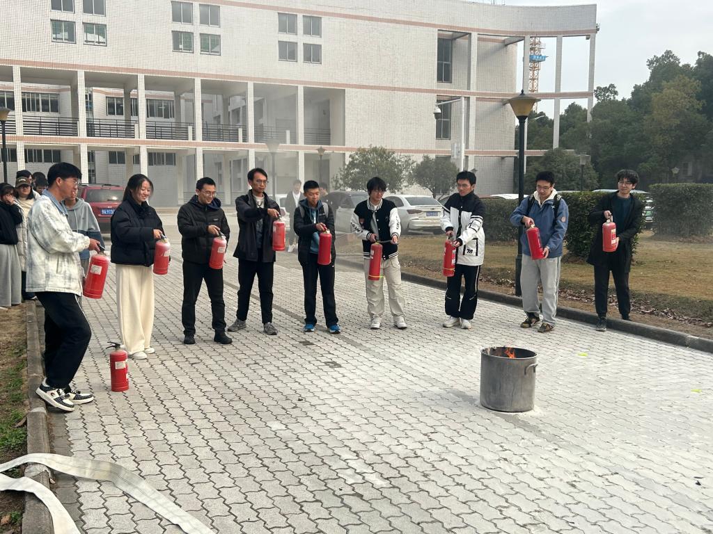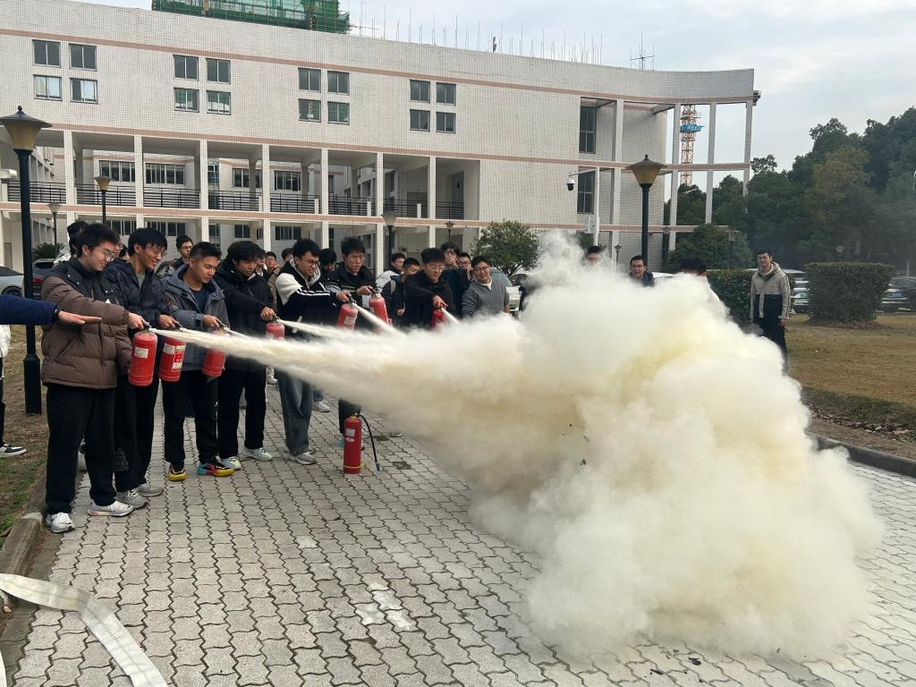 在楼外实操场地,同学们在专业指导下开展灭火器实操演练。大家轮流上阵,按照“提、拔、握、压”的口诀,对准模拟火点进行喷射,从初期的生疏紧张到后期的熟练规范,切实掌握了初期火情的处置方法。演练环节安全保障到位、流程设置科学,有效消除了师生对火灾的恐惧心理,增强了“见火不慌、抬手就灭”的实战底气。