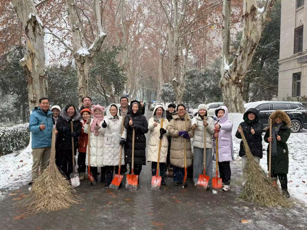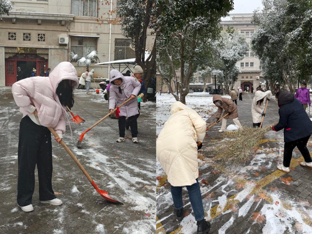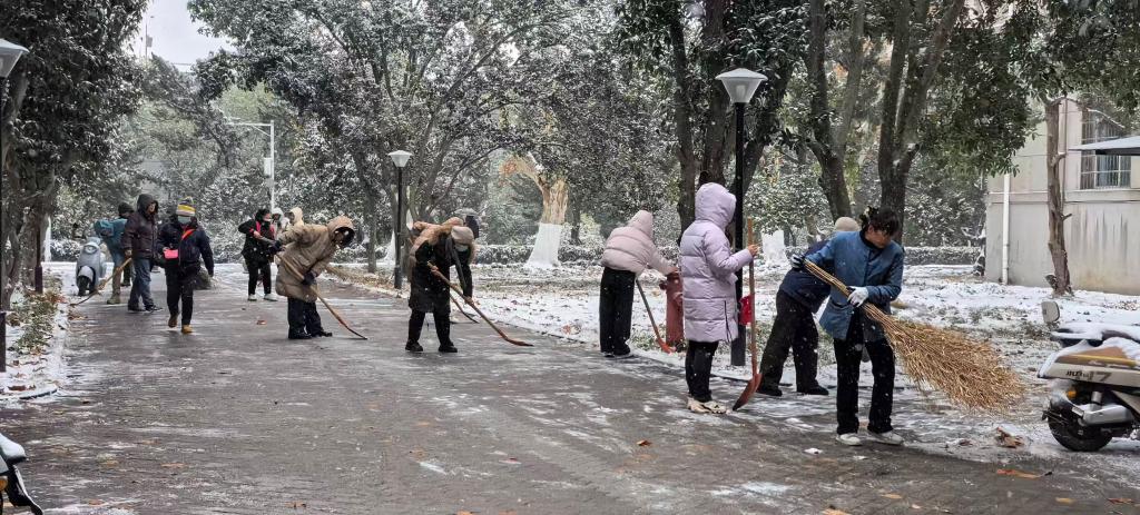 扫雪护行,情暖寒冬。1月20日,武汉突降暴雪,为消减极端天气影响、畅通师生出行路,公司行政党支部迅速带领全体行政人员开展“扫雪除冰志愿活动”,大家手持扫帚、铁锹等工具,对南一楼东侧人行道、电动车停放等重点区域开展除雪工作。