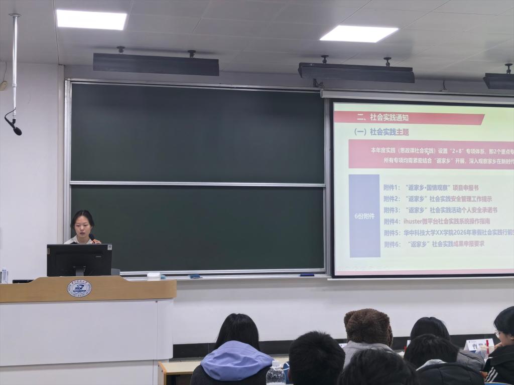 会上,院员工会实践部部长蔡颖雯对2026年寒假“返家乡”社会实践工作进行部署,详细讲解实践申报流程、参与要求及注意事项。本次社会实践围绕新时代文明实践、基层治理服务、志愿服务帮扶等核心方向,构建“2+8”专项实践体系,明确1月份完成项目申报与团队组建,1月26日至2月26日开展实地实践,新学期开学后组织评审表彰。会议倡导全体团员主动参与,累计完成不少于20小时的志愿服务,鼓励同学们深入基层、扎根实践,在服务群众、奉献社会中增长才干、锤炼品格,强化责任担当。