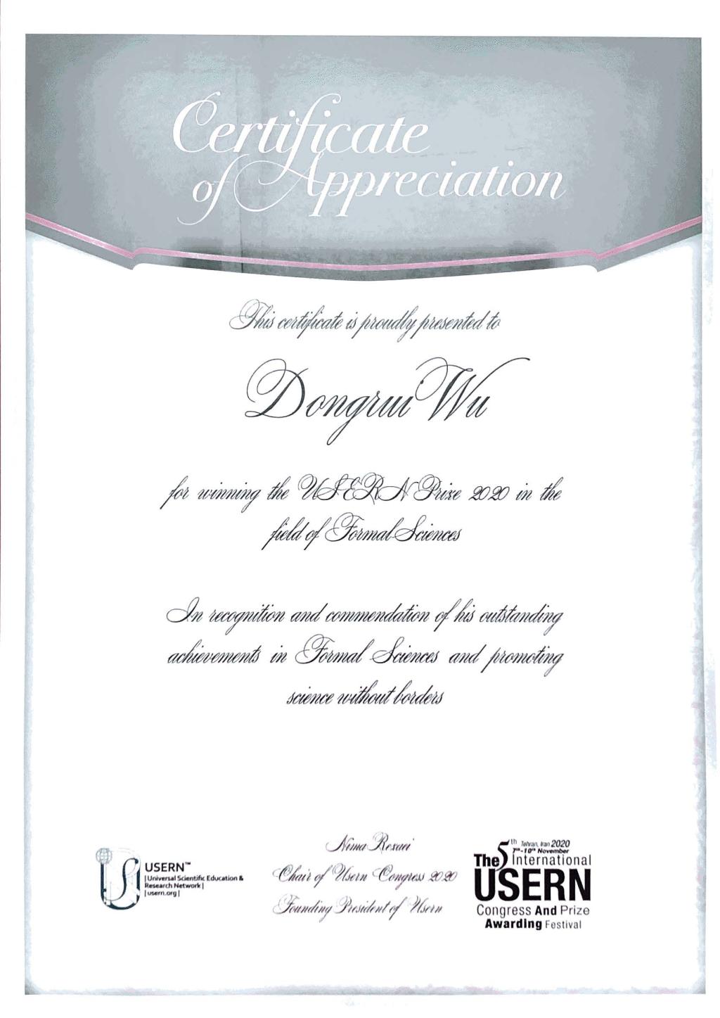 因为脑机接口和机器学习方向的贡献,伍冬睿也于2020年11月获得了USERN形式科学奖,这是中国科学家首次获得 USERN Prize。该奖评审由 USERN 咨询委员会负责,其成员均为世界各领域前1%的科学家,包括16位诺贝尔奖获得者和2位阿贝尔奖获得者。