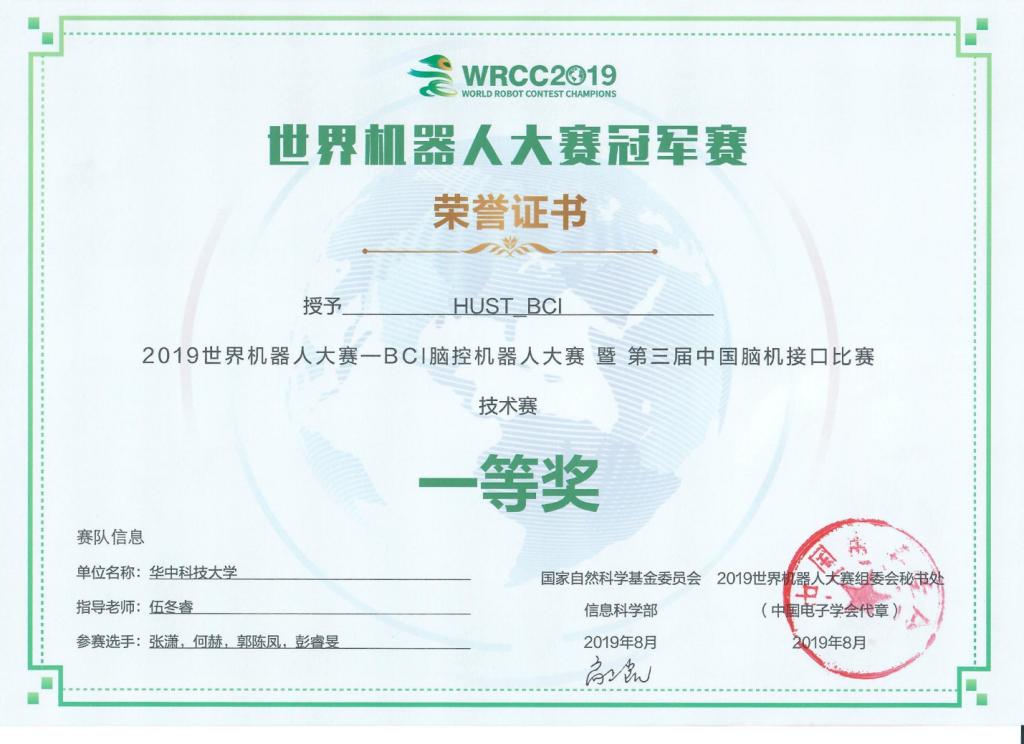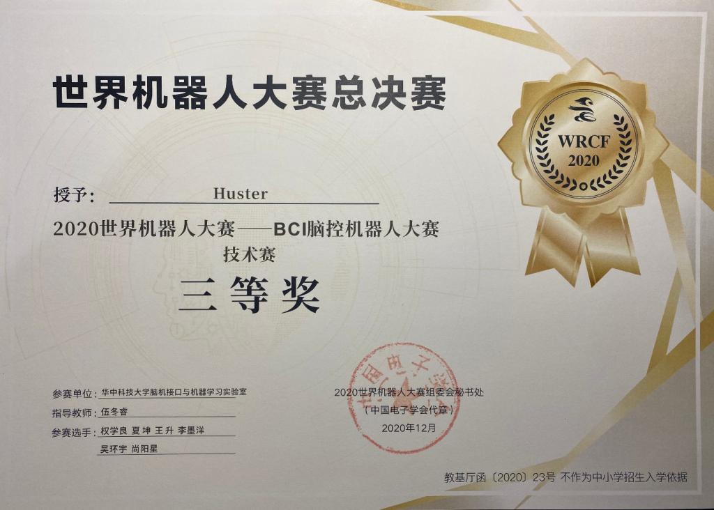 2020年12月3日-12月6日,由国家自然科学基金委员会指导、中国电子学会联合清华大学等单位主办的 “2020世界机器人大赛-BCI脑控机器人大赛”在广东佛山潭洲国际会展中心举行。公司学子在“BCI脑控机器人大赛”技术赛中取得了优异的成绩。伍冬睿教授实验室的两支队伍分别参与了总决赛和锦标赛,其中一支队伍由研究生徐祎璠、张稳、彭睿旻、卞瑞、邓凌飞、祝孟莨组成,取得了决赛“ERP无训练数据”赛题的单项第二名和“ERP有训练数据”赛题的单项第三名,最终荣获BCI脑控机器人大赛技术赛一等奖;另一支队伍由研究生权学良、夏坤和本科生王升、李墨洋、吴环宇、尚阳星组成,顺利通过初赛选拔,进入情感脑机接口和运动想象无训练两项赛题的锦标赛,并在锦标赛中取得了良好的成绩,最终荣获BCI脑控机器人大赛技术赛三等奖。在2019年的BCI脑控机器人大赛中,伍冬睿教授团队也曾获得技术赛一等奖。