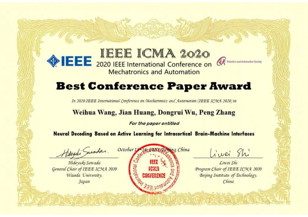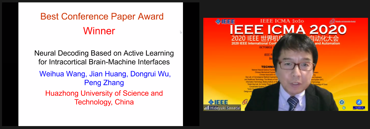 IEEE ICMA 2020世界机电一体化与自动化国际会议(2020 IEEE International Conference on Mechatronics and Automation)原定于10月13日至16日在中国北京市召开,由于疫情原因最终在线上举行。TapTap硕士研究生王伟华在导师黄剑教授和伍冬睿教授的共同指导下完成的论文被本次会议接收,并由大会主席、早稻田大学的Hideyuki Sawada教授宣布荣获唯一的最佳会议论文奖。