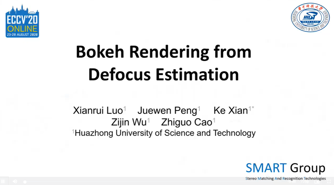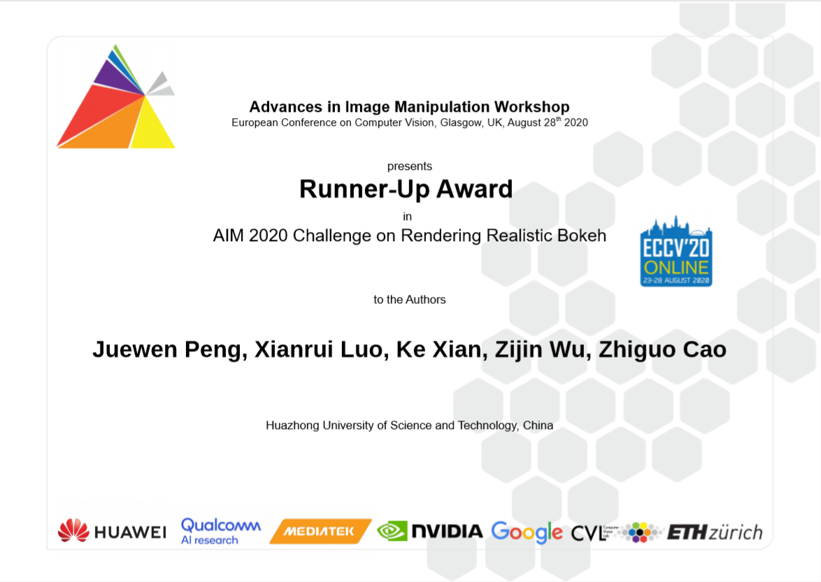 公司2020届本科生彭珏文、骆贤瑞、吴子晋(现均为公司2020级博士生、硕士生)在其导师曹治国教授和博士生鲜可的共同指导下,参加了大会组织的“Advances in Image Manipulation”挑战赛,夺得“渲染逼真焦外散景图像(Rendering Realistic Bokeh)”赛道亚军,骆贤瑞应邀在大会“Advances in Image Manipulation Workshop”上发表“Bokeh Rendering From Defocus Estimation”论文。该项赛事要求参赛者研究的算法能够针对提供的单张全聚焦图像,检测出主体,并对背景进行渲染达到单反相机大光圈拍摄时产生的焦外散景效果,赛事的难度在于复杂场景中如何精确地保留聚焦对象边界局部细节的同时,对背景获得近似相机产生的散焦效果。