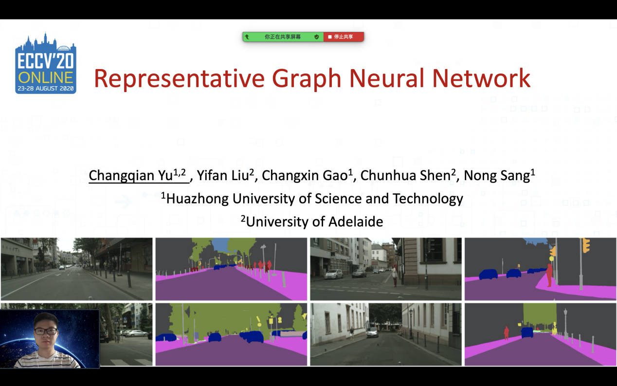博士研究生余昌黔在桑农教授、高常鑫副教授和澳大利亚阿德莱德大学的沈春华教授的指导下,在大会发表了“Representative Graph Neural Network”论文。该论文的研究工作在国家自然科学基金重点项目及面上项目的资助下,针对上下文关系建模问题,提出了一种代表性图网络用于提取代表性点的特征信息,进而高效地建模上下文关系。当前长距离上下文关系主要基于非局部算子建模。然而非局部算子需计算特征图上所有点对之间的关系,复杂度较高。通过统计分析,本研究发现非局部算子中存在大量冗余计算。因此本研究提出了代表性图网络,通过学习代表性点的位置提取代表性点的特征,大大减少冗余计算,从而高效地表征上下文关系。实验结果表明,该方法在语义分割、实例分割、目标检测等任务上性能均超越了非局部算子,同时也超越了当前其他先进算法。