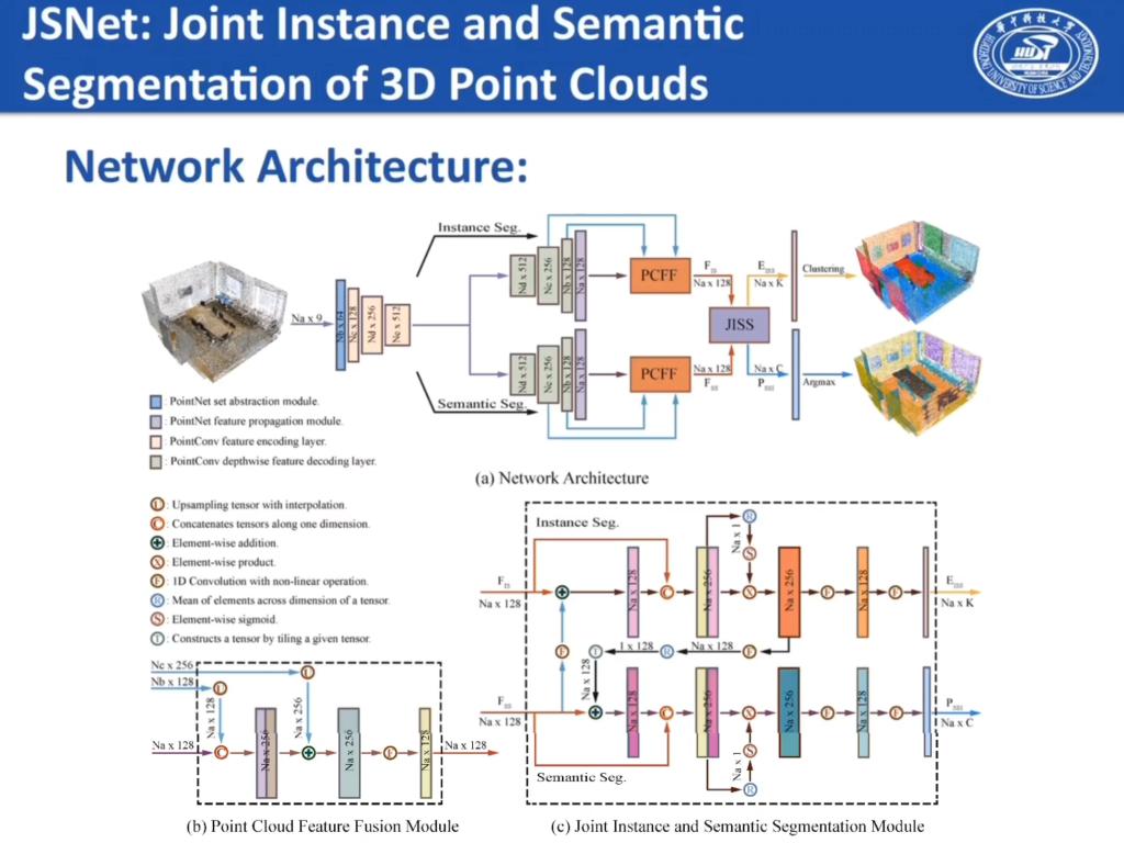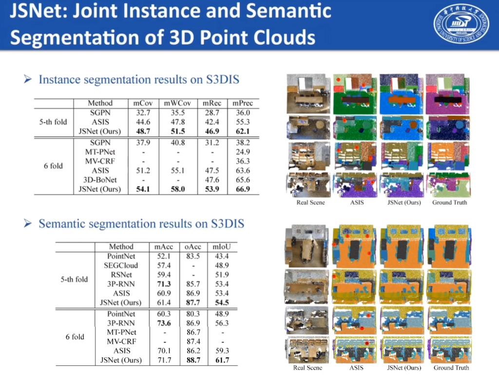 博士生赵蔺同学在AAAI2020会议上发表了一篇论文“Lin Zhao, Wenbing Tao*, JSNet: Joint Instance and Semantic Segmentation of 3D Point Clouds, AAAI2020”,文章提出一个新的联合实例和语义分割的方法深度学习网络JSNet,可以同时处理三维点云的实例分割和语义分割问题,通过构造点云特征融合模块来融合骨干网络中不同层的特征,进而设计实例—语义联合分割模块将语义特征转换到实例嵌入空间,同时聚合实例特征到语义特征空间,从而有效提高三维点云的实例及语义分割结果。
