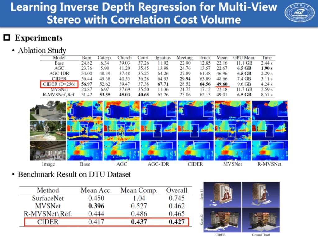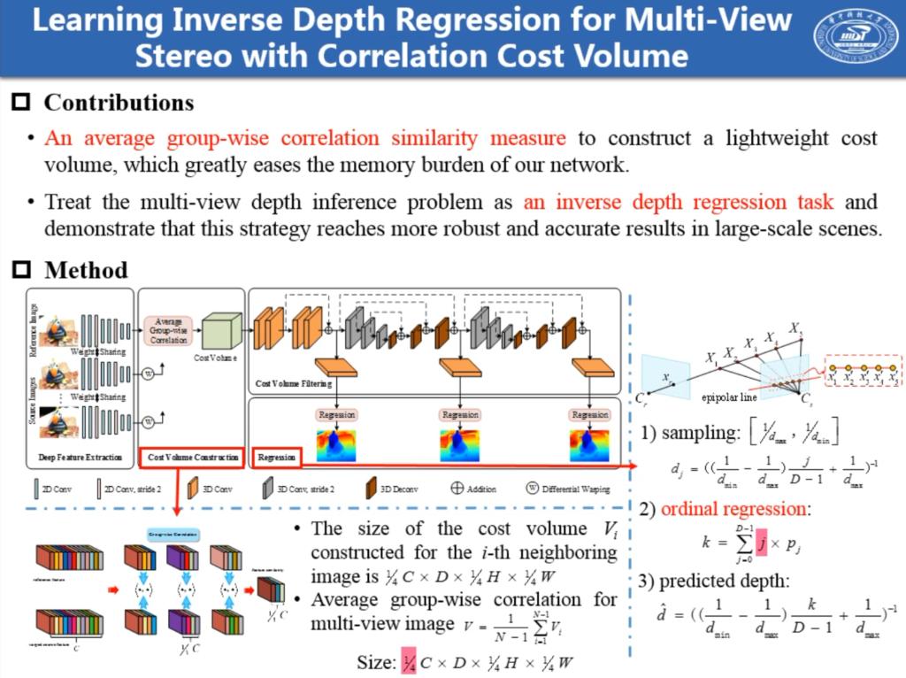 论文“Qingshan Xu, Wenbing Tao*, Learning Inverse Depth Regression for Multi-View Stereo with Correlation Cost Volume, AAAI 2020”提出基于逆向深度回归的深度学习框架来解决多视图立体视觉问题,并采用相关代价体融合策略减少深度网络的参数量,与其它深度网络相比,该网络利用较少的参数可以达到更好的性能。