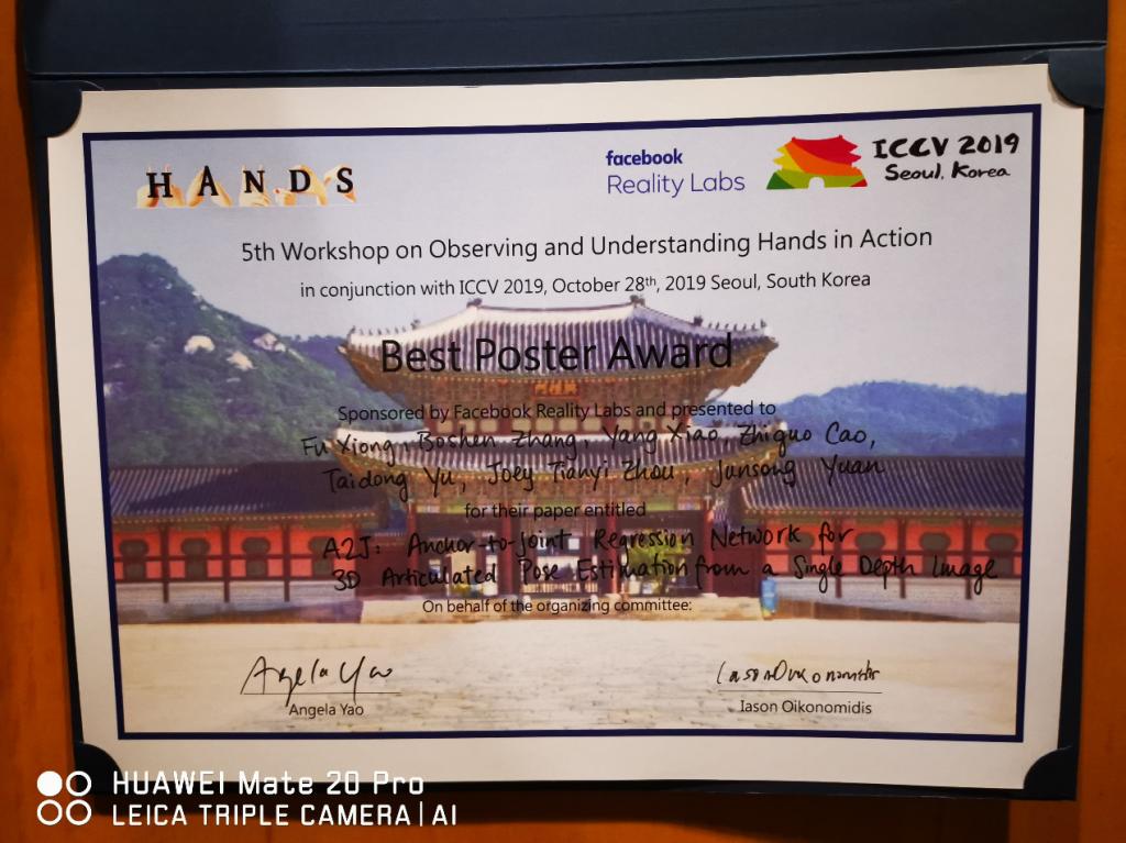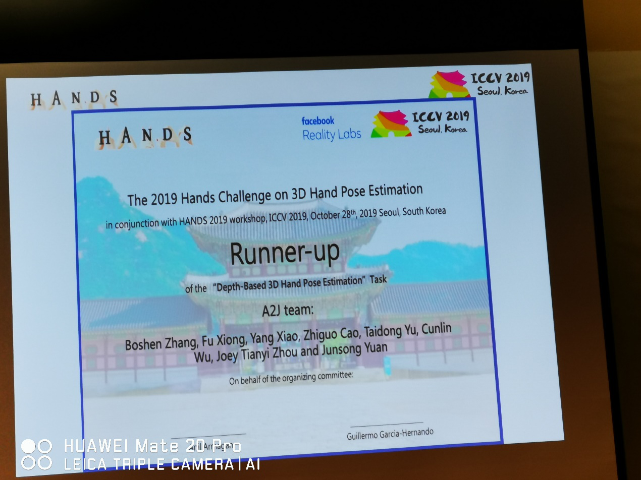 大会组织的“The Hands Challenge on 3D Hand Pose Estimation”全球竞赛结果也于10月28日揭晓,公司硕士生熊拂、张博深、于泰东等同学在肖阳副教授、曹治国教授的指导下,参加了“Depth-Based 3D Hand Pose Estimation”和“Depth-Based 3D Hand Pose Estimation while interacting with Object”两个任务的竞赛,均获得第二名,获得了组委会颁发的亚军获奖证书,其学术报告也被评为该专题Workshop的最佳Poster论文。