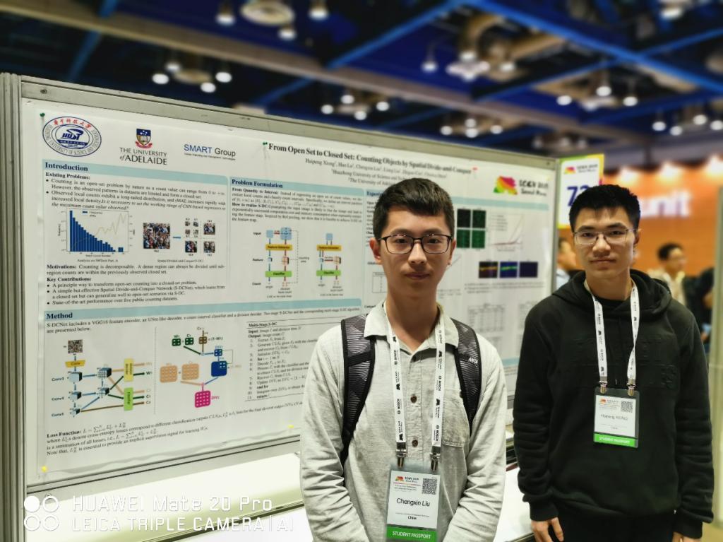 曹治国教授指导的研究生熊海朋、刘承鑫等同学在大会发表了“From Open Set to Closed Set: Counting Objects by Spatial Divide-and-Conquer”论文,该论文的研究工作在国家自然科学基金面上项目的资助下,通过分析现有基于计算机视觉的目标计数方法无法从数量上泛化到现实场景中的问题,发现现有方法都是在有限的训练集(闭集)中学习到有限数量范围内的精确计数,而忽视了现实场景中目标数量可能无上限(开集)的情况,导致现有方法不能很好地泛化到开集中。本研究利用计数值可以空间分解的物理特性,提出利用空间分治,将目标数量转化到可以准确预测的闭集范围内,从而使计数网络可以泛化到现实的开集场景中。该方法直观高效,在三个人群数据库、一个车辆数据库和一个农作物数据库上均大幅领先之前的方法,并达到当前最佳性能。