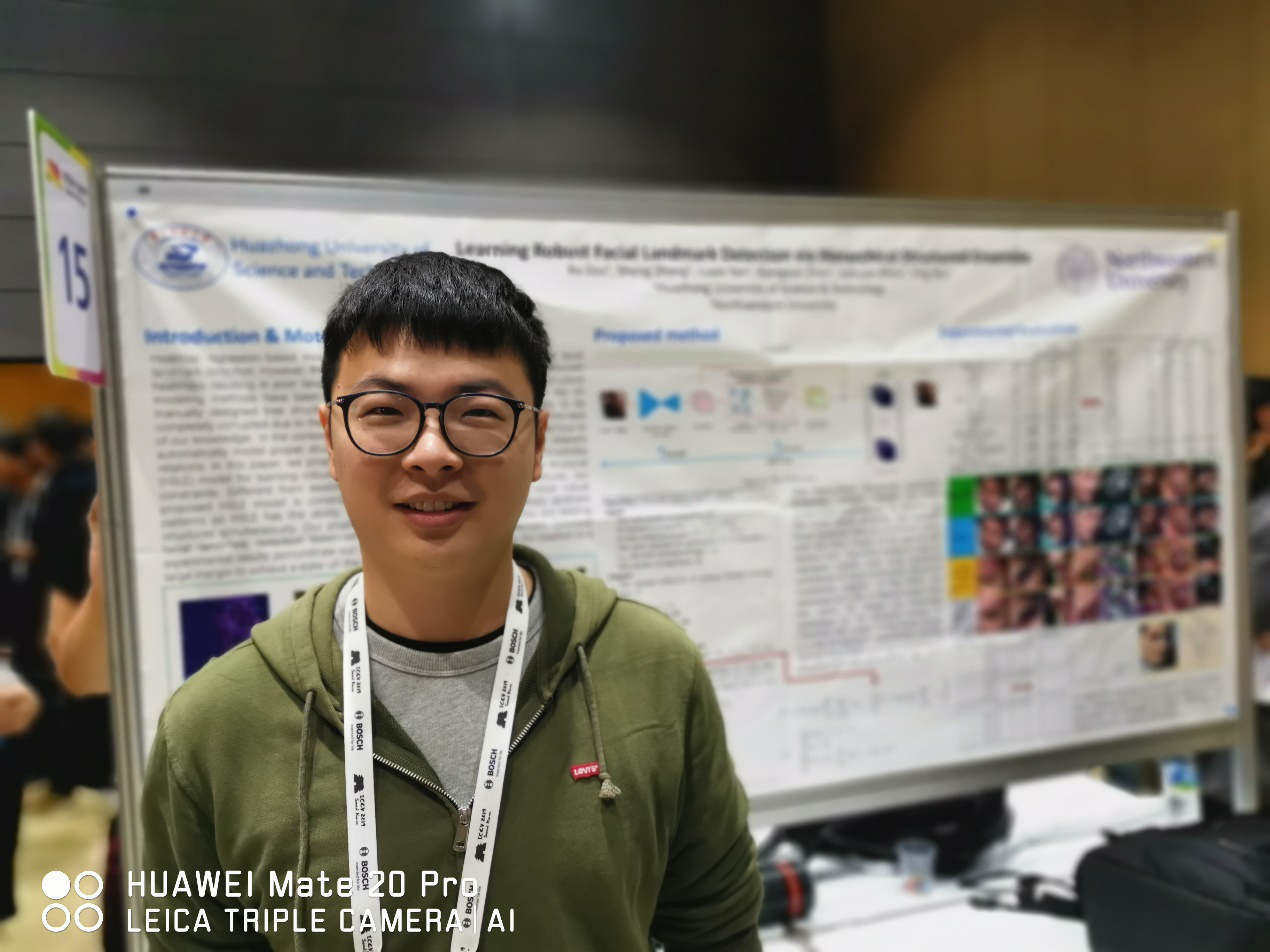 博士研究生邹旭在钟胜教授、颜露新教授和美国西北大学的Ying Wu教授的指导下,在大会发表了“Learning Robust Facial Landmark Detection via Hierarchical Structured Ensemble”论文。该论文的研究工作在国自科青年基金和中国博士后科学基金等项目的资助下,针对传统基于热力图回归的人脸标志点检测方法存在因夸张表情、部分遮挡等特殊情况导致回归处存在多峰、偏移等不准确热力图的难题,提出了一种通过发现人脸图像中稳健的模式而自动构建的分层结构化标志点集成(HSLE)模型,作为人脸标志点间全局和局部的结构化约束并从中学习,使最终回归的人脸标志点热力图更加准确,进而达到提升人脸标志点检测性能的目的。该论文提出的模型可以很容易地集成到现有的基于热力图回归的人脸标志点检测模型中,以进一步提高人脸标志点检测性能。该方法在两个人脸标志点检测数据集上对多个基线方法均有大幅度提升。