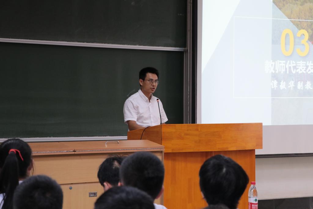 教师代表智能系支部书记谭毅华副教授为新生送上寄语。他表示,想要在祖国大发展的浪潮中勇立潮头,做时代弄潮儿,就要树立自己的信念,谋一域发展,要在AIA大家庭中成长、升华自我;要与国家同呼吸,共命运,并以独特的视角为新生们解读了公司英文缩写“AIA”所代表的含义——爱、优秀和自信。