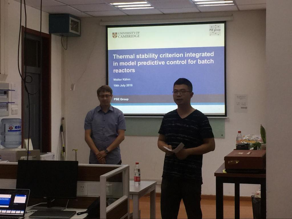 7月19日下午,英国剑桥大学Walter kahm 博士应邀来公司进行学术交流,并做了题为“Thermal stability criterion integrated in model predictive control for batch reactors”的学术报告。报告会由袁烨教授主持,卢森堡大学Jorge教授等20多位师生参加了报告会。