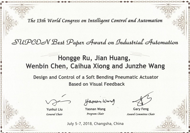 软体机器人是当前机器人领域热点之一,相较于传统刚性机器人,弯曲软体气动驱动器在康复医疗、智能假肢、助力辅助等领域的应用中有着广阔的前景。同时基于高速单目相机的视觉识别,一定程度上实现了弯曲气动肌肉的反馈控制,对此类驱动器的控制问题提出了一个可行的解决方案。基于此工作,在黄剑教授和机械公司熊蔡华教授共同指导下,茹宏格同学在会场做了题为“Design and Control of a Soft Bending Pneumatic Actuator Based on Visual Feedback”的学术报告,并获得“Best Paper Award”。