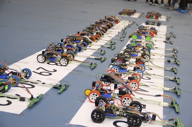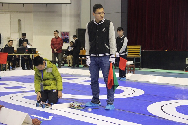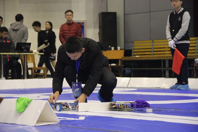 比赛在校团委副书记李嵩给出的发车指令声中开始。决赛采取两车一组同台竞争的形式,小车需要在无人操控的情况下,自行识别路况,完成U型转弯、十字交叉路、S型车道等复杂路况的通行,顺利跑完全程用时最短者胜出,两车竞赛增加了比赛的激烈程度和观赏性。除了公司的参赛队伍,还有来自武汉科技大学,以及中小学的队伍参加这次科技盛会。