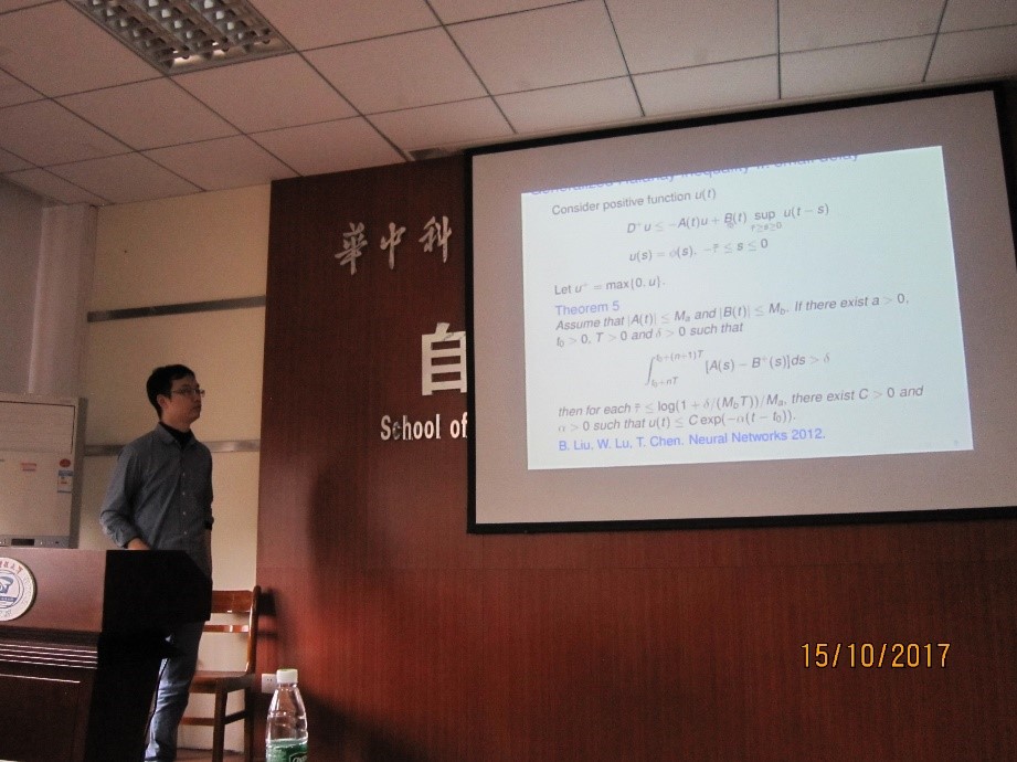 下午三点,卢文联教授作了题为“Coordination in complex networked systems with diverse coupling configurations: time-dependent, delay and event-triggering”学术报告。报告围绕复杂网络系统的同步和一致性问题展开。卢教授介绍了自己近几年相关的研究成果,即不同情形下复杂网络个体间的合作协同行为,包括以下三种情形:时变拓扑与时变耦合,网络通讯延迟、过程延迟,事件驱动与自驱动规则。