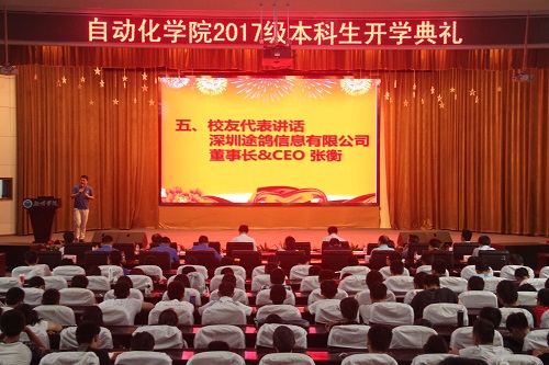95级员工、深圳途鸽信息有限公司董事长张衡先生回顾了自己的学习和工作经历,结合自己的人生阅历向新生们分享了三点体会。他希望同学们在学习专业知识的同时,通过广泛的阅读及实践锻炼,提高人文修养,树立正确的人生观、价值观;在追求理想的过程中,留意沿途的风景,多交一些好朋友,并主动与朋友分享自己一路的精彩;建立人生格局,在不断挑战自我、突破创新的同时还要关心社会,承担社会责任,培养家国情怀。