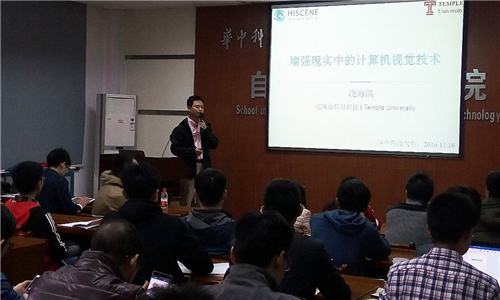 2016年11月18日上午9点30分,美国天普大学(Temple University)计算机系凌海滨教授应曹治国教授邀请来自动化公司作了关于增强现实与计算机视觉研究的学术报告,报告题目是“增强现实中的计算机视觉技术探索”。报告会由肖阳副教授主持,公司从事机器视觉和模式识别相关研究的老师和员工共40余人参加了报告会。
