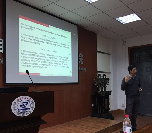 报告中,毛学荣教授介绍了一类带有时变时滞的多维非线性随机时滞微分方程$dx(t)=f(x(t-\delta_1(t)),t)dt+g(x(t-\delta_2(t)),t)dB(t)$的几乎处处指数稳定性。毛教授指出如果不带有时滞的随机微分方程 $dy(t) =f(y(t),t)dt+ g(y(t),t) dB(t)$是几乎处处指数稳定的,则存在正数$\tau^*$,当时变时滞能被$\tau^*$界定的时候,相应的随机时滞微分方程也是几乎处处指数稳定的,并且给出了计算$\tau^*$的具体表达式。而且,这一理论能够实现设计随机时滞反馈控制器来镇定一个不稳定的微分方程。最后在自由讨论环节,毛教授热情地回答了多名师生的提问。