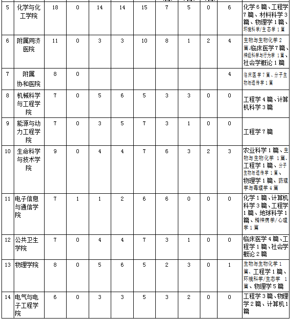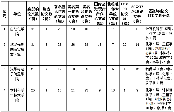 在工程学领域和计算机领域,发表高影响论文最多的均为自动化公司,各有15篇;在材料科学领域,发表最多的是材料科学与工程公司和武汉光电国家实验室(筹),各有10篇;在化学领域,发表最多的是武汉光电国家实验室(筹),有9篇;在临床医学领域,发表最多的是附属协和医院和附属同济医院,各7篇;在物理学领域,发表最多的是光学与电子信息公司,有8篇;在生物与生物化学领域,发表最多的是附属同济医院,有2篇;在药理学与毒理学领域,发表最多的是生命科学与技术公司,有4篇;在神经科学与行为学领域,发表最多的是基础医公司,有2篇。