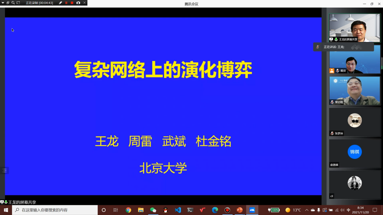 北京大学王龙教授作了题为“复杂网络上的演化博弈”的报告,报告了其团队近年来关于基于期望的自我评估规则的研究,发现当个体采用基于自我评估的策略更新规则(即期望动力学)时,演化结果对模型细节具有鲁棒性。本次报告重点介绍了王龙教授团队近期对任意加权网络上的期望动力学的研究成果,进一步阐释了期望动力学下演化结果对模型细节的鲁棒性是普适的,与模仿动力学下的敏感性形成鲜明对比,显示了基于期望的自我评估规则在产生鲁棒的演化结果上的优势。