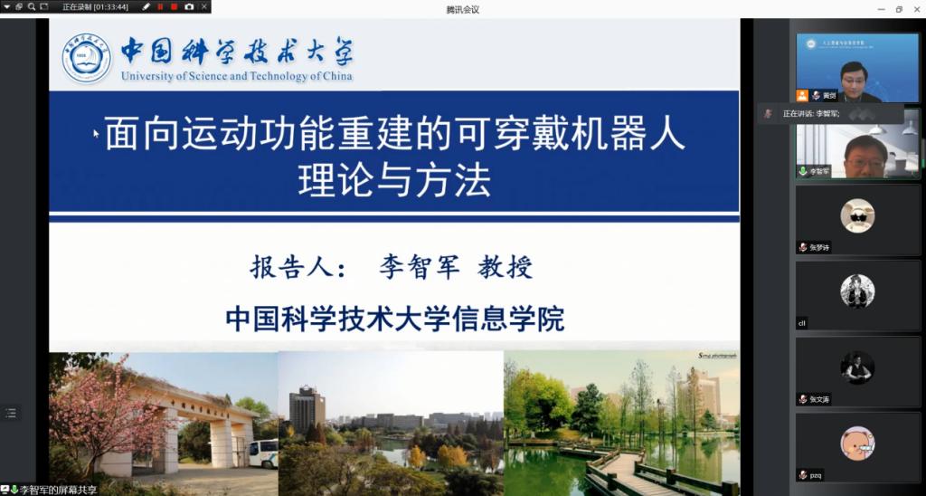 中国科学技术大学李智军教授作了题为“面向运动功能重建的可穿戴机器人理论与方法”的报告。他指出:现有的可穿戴机器人缺乏人机合作混合智能,导致人机自由交互困难,因而亟需提升人机合作混合智能水平、实现人机合一。李教授领导的团队针对可穿戴机器人的控制理论与方法展开了长期攻关,解决了四个主要问题:操作主体的运动意图认知、人机技能传递机理与变刚度控制、人在环中的人机强耦合控制优化以及面向控制安全的操作主体人机验证。