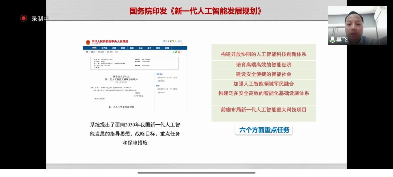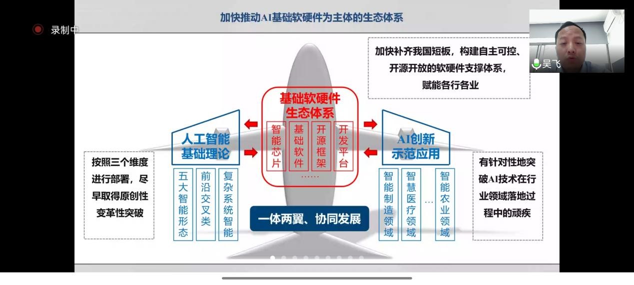 最后,吴飞教授提到中国人工智能所面临的严峻挑战,从竞争与合作的复杂立场,到脱钩与遏制的针锋相对,要推动人工智能生态发展就需要构建良好的生态,如国家新一代人工智能开放创新平台、创新发展试验区、先导区等的设立以及各大高校设立相关专业进行人才培养等。