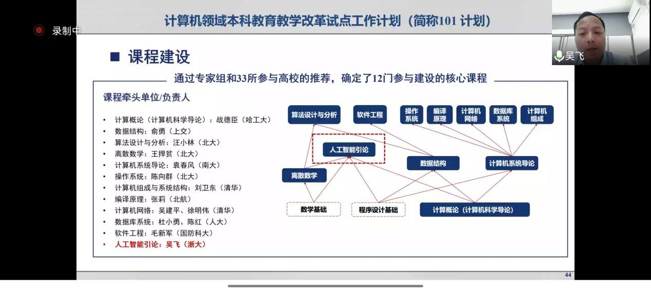 吴飞教授还对我国人工智能人才培养工作做了介绍。2021年高教司决定在部分高校实施计算机领域本科教育试点工作计划(简称101计划),该计划设置12门课程,每门课程分解成50个知识点同时由一所高校进行牵头。吴教授介绍,招收人工智能专业的员工,培养交叉学科的人才,必须要确保“教材、课程和实训平台”三位一体,成立新一代人工智能系列教材编委会编写教材,保持教材整体风格,线上线下课程齐步推进,同时还推出了新一代人工智能科教平台“智海”保证实训需求。为了鼓励非计算机专业员工学习和了解人工智能,华五首倡、六校联合、企业参与开设AI+X微专业。为了普及和覆盖低年龄层次人群和多职业人群,他们编写了高中信息技术教材和通俗易懂有声读物,开设“灰犀牛”班培养航天科技人员。